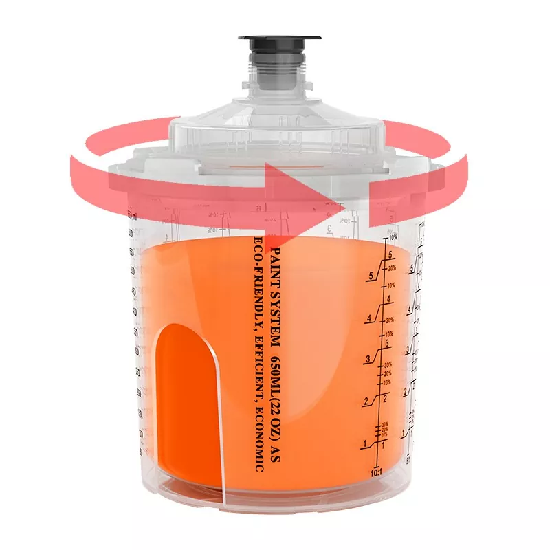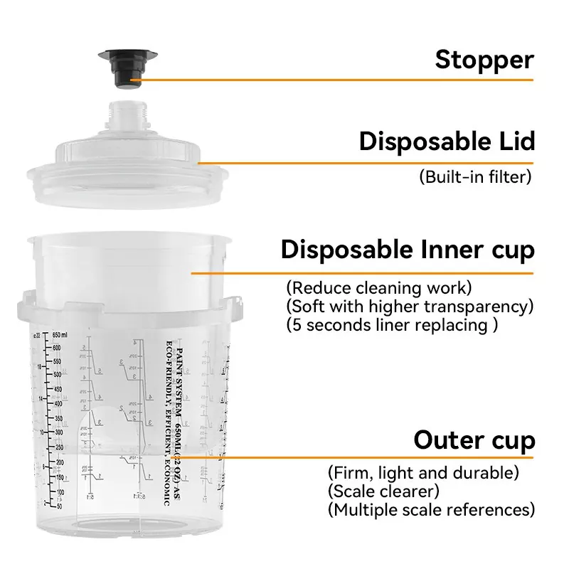 -Jendela potongan di cangkir keras memungkinkan Anda memantau level cat dengan mudah kapan saja, dan tutup cangkir dapat dengan mudah dilepas dengan memegang lapisan melalui badan cangkir saat mengisi ulang atau mewarnai cat.
