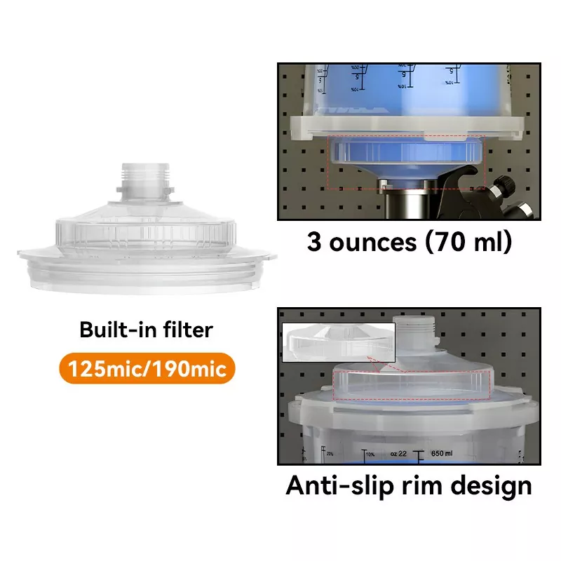 -Tutup cangkir semprot sekali pakai AYS3.1 memiliki konstruksi dua lapis yang mampu menampung hingga 3 ons (70 ml) cat di bawah filter. Tutupnya meningkatkan aliran dan konsistensi cat, sehingga mengurangi percikan cat.