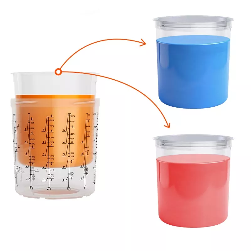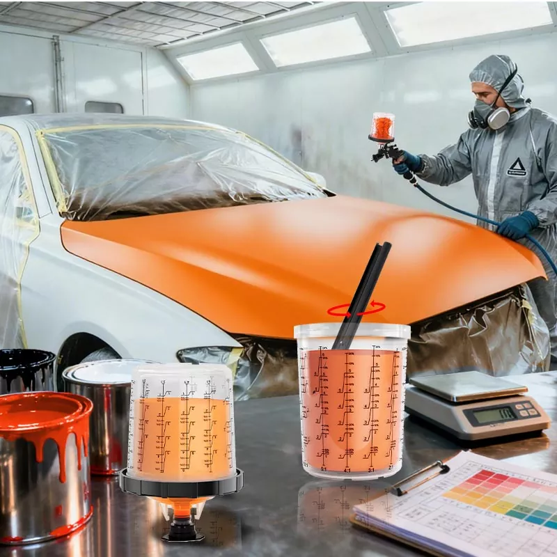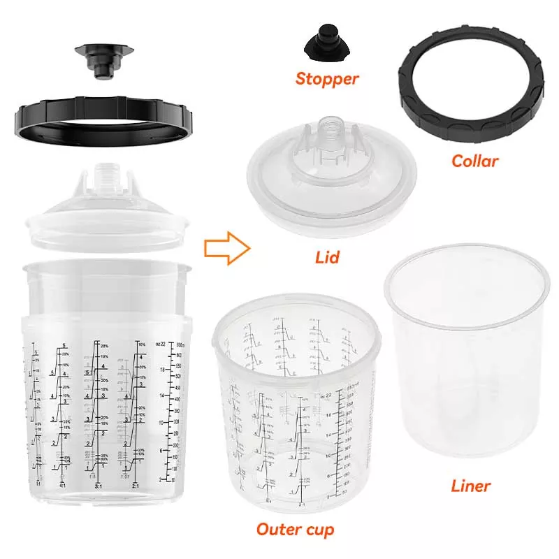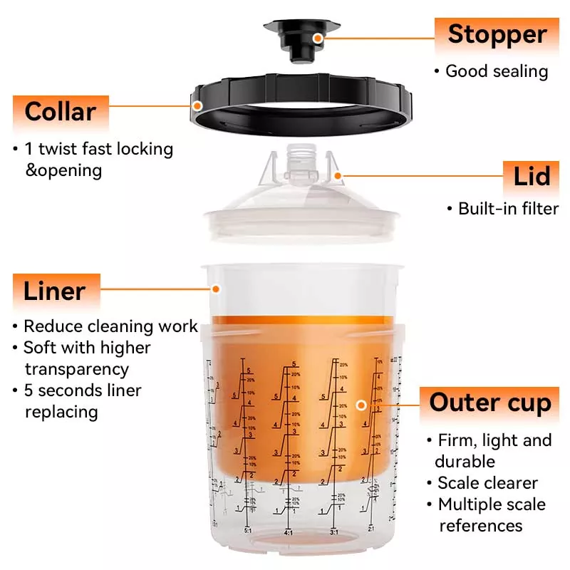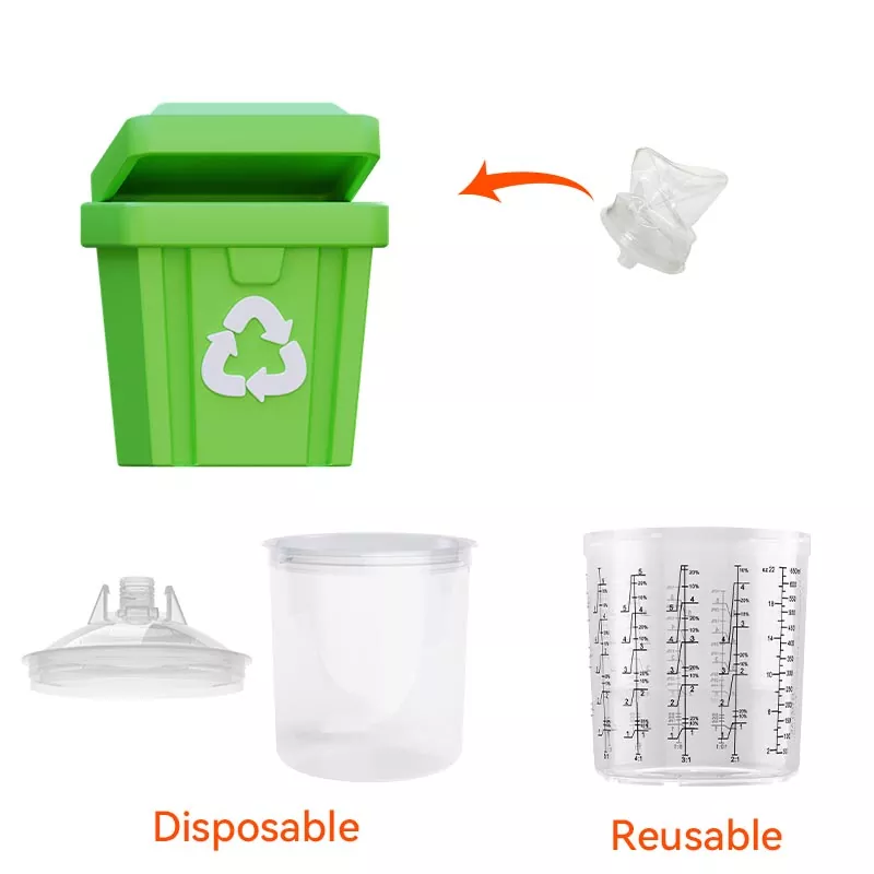 Sistem cangkir cat sekali pakai menggabungkan fungsi pencampuran, penyaringan, penyemprotan, dan penyimpanan dalam satu unit. Hal ini tidak hanya menyederhanakan persiapan pra-cat tetapi juga menghemat biaya pencampuran cangkir dan corong kertas, menjadikannya pilihan sempurna untuk menghemat waktu persiapan dan meningkatkan efisiensi penyemprotan.