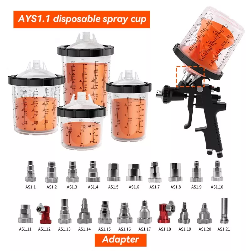 Cangkir semprot sekali pakai AYS1.1 kompatibel dengan adaptor seri PPS1.0. Dengan adaptor, alat ini dapat disesuaikan secara sempurna dengan pistol semprot merek apa pun dan dapat digunakan dalam posisi apa pun tanpa risiko cat menetes.