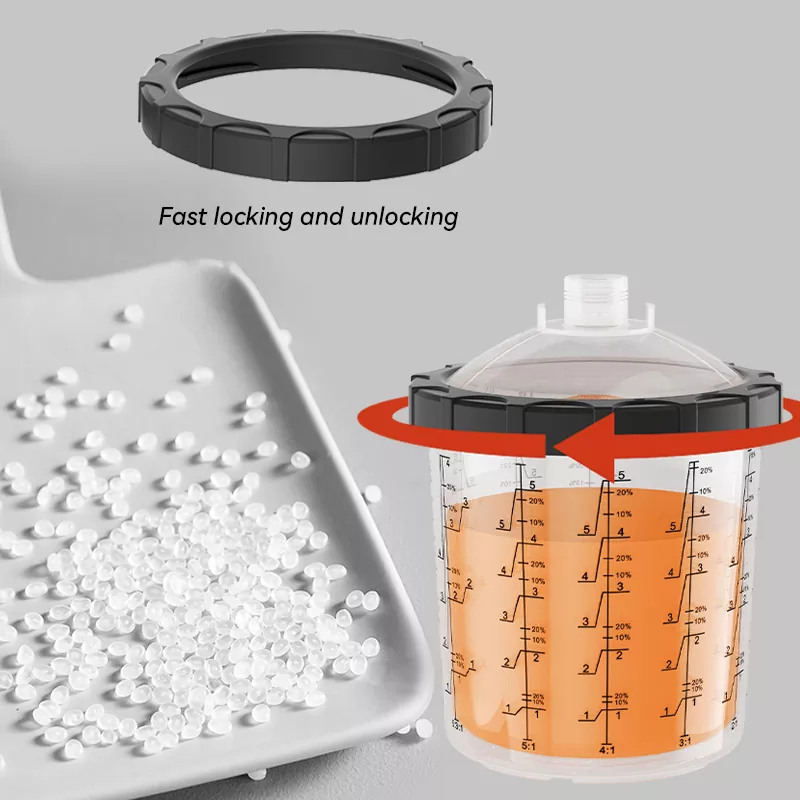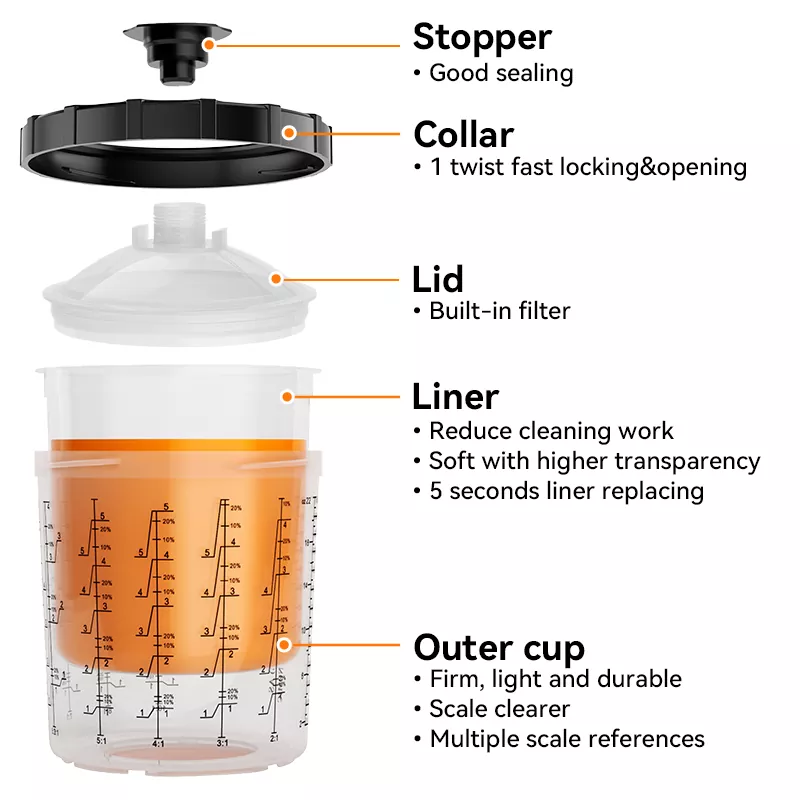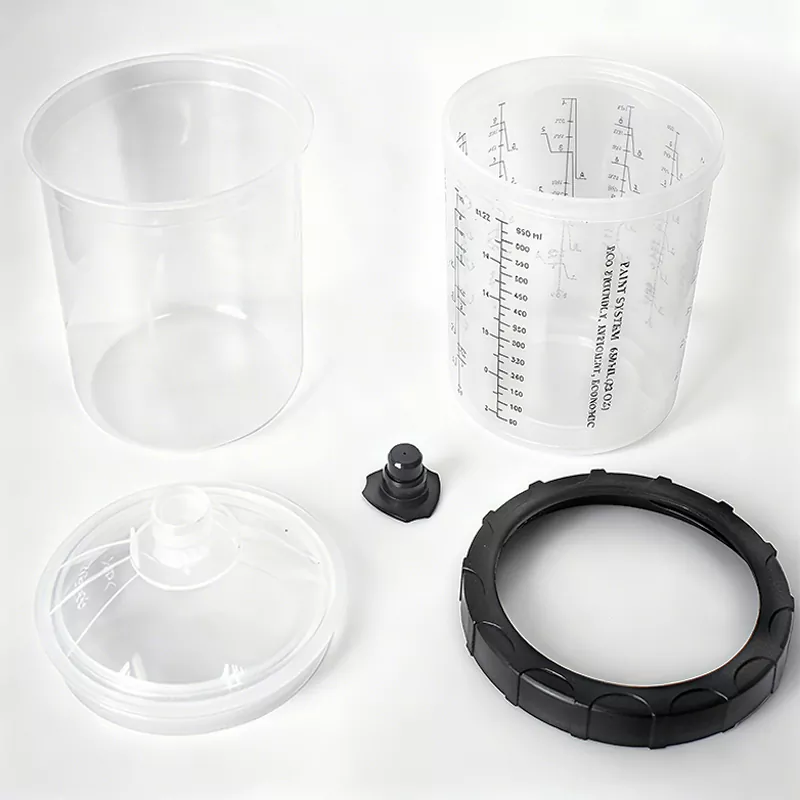 850ML Speedy Paint System 2.0 terutama terdiri dari 5 bagian: Steker, tutup, kerah, liner, dan cangkir luar. Diantaranya, kecuali bagian dalamnya terbuat dari PE, sisanya sebagian besar terbuat dari PP. Liner sangat lembut dan mudah dilepas dan diganti; bagian lainnya kokoh dan sangat tahan lama. Munculnya sistem wadah cat sekali pakai dapat dengan sempurna menggantikan sistem pengumpan gravitasi tradisional, yang tidak hanya mengurangi biaya pencucian, namun juga meningkatkan tingkat pemanfaatan cat, sehingga menghemat biaya. Terlebih lagi, karena tidak perlu membersihkan sistem cawan, pelukis akan terhindar dari kontak langsung dengan cat beracun, sehingga kesehatannya terjamin. Mengembangkan dan memproduksi produk yang ramah lingkungan dan efisien adalah apa yang dilakukan Aspaint.