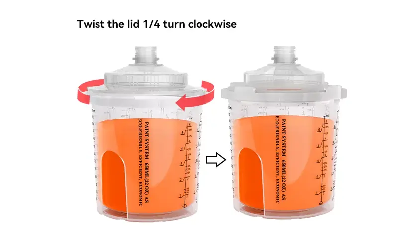 Kumpulkan semua komponen sistem cangkir cat sekali pakai: tutup, liner, cangkir keras dan stopper